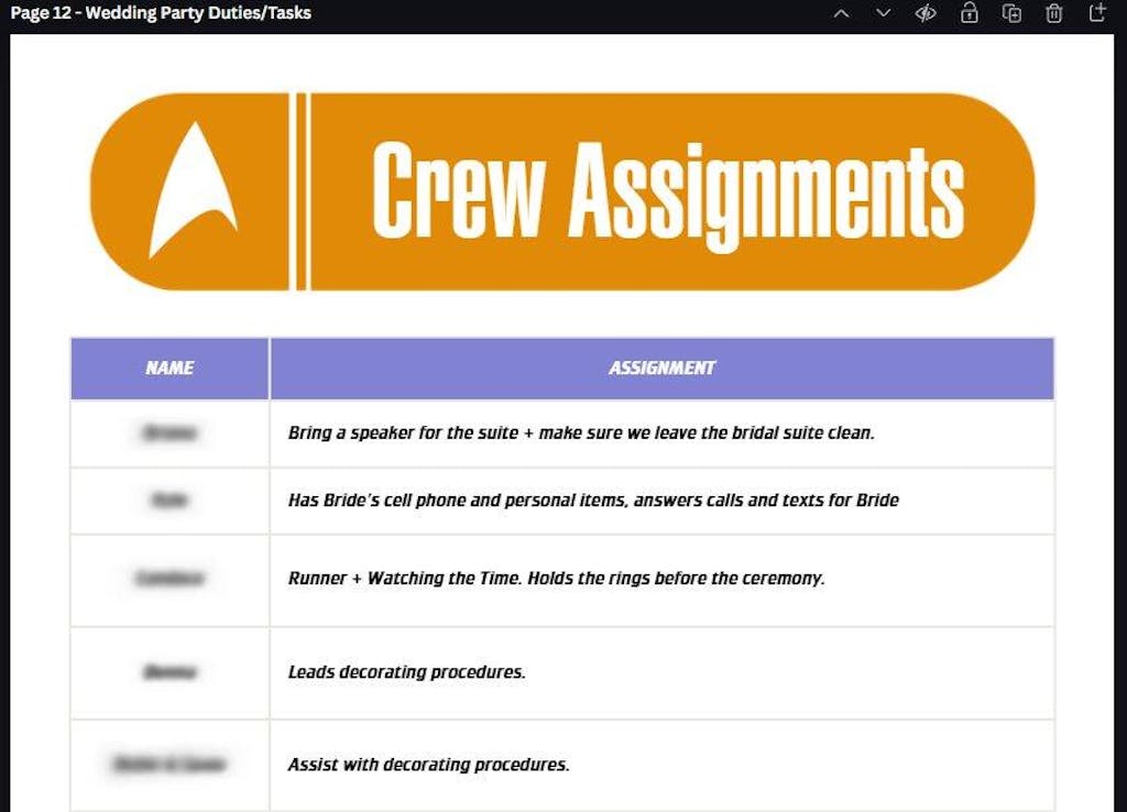 As a canva addict, this was the perfect binder template for me. It's genuinely got everything you might otherwise forget and is perfect for the kind of couple that is budget-minded. I LOVE the customization too - I've been able to completely overhaul the design and make it "star trek" themed for our nerdy wedding!