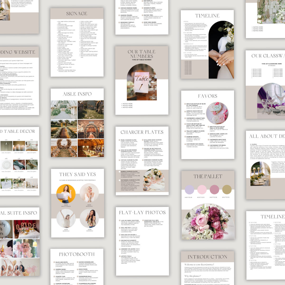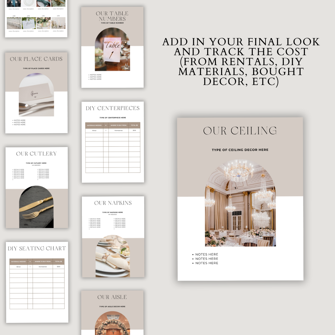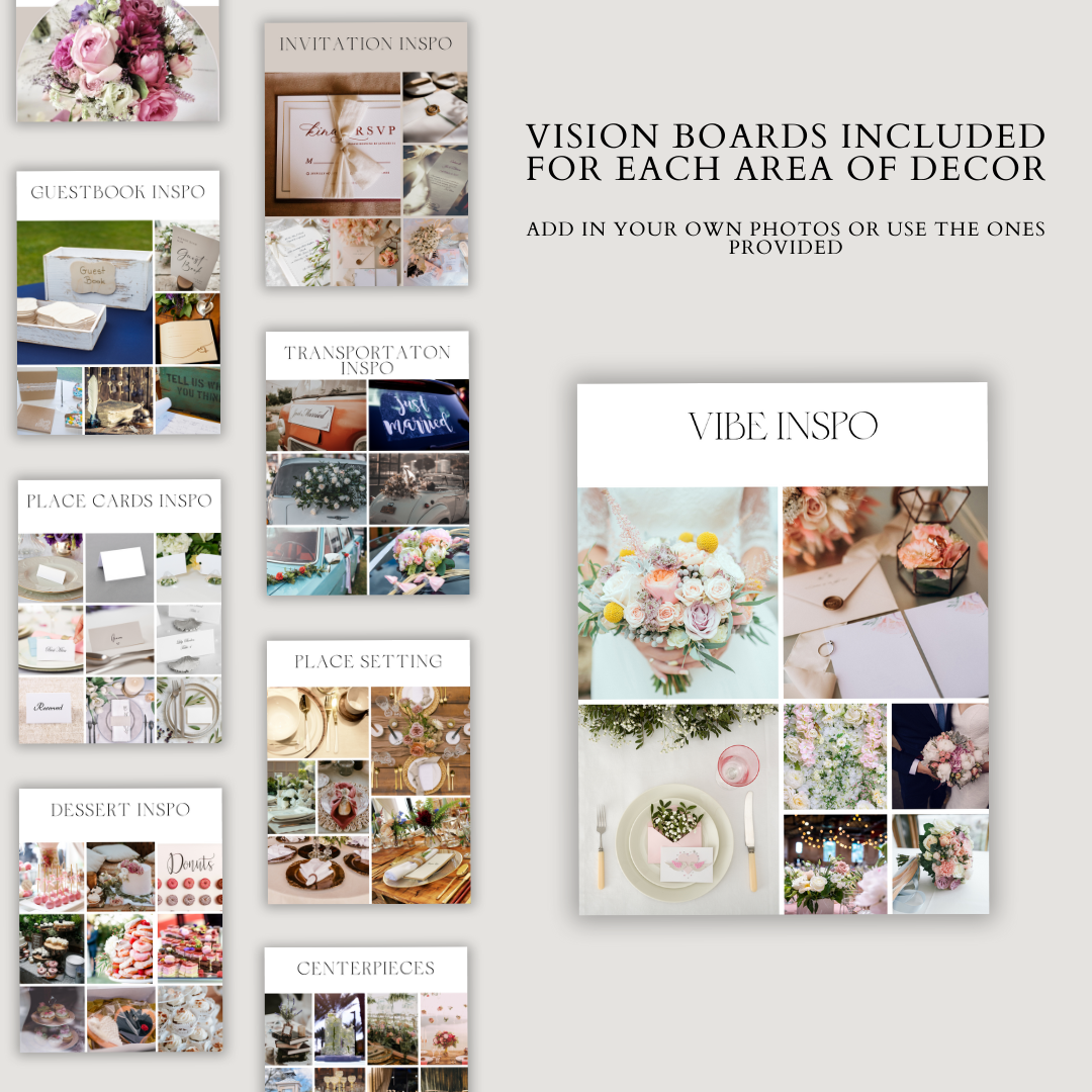 - Vision Boards for Every Piece of Decor: From the overall vibe to specific elements like charger plates, napkins, invitations, bridesmaid proposal boxes, place cards, centerpieces, table numbers, and more.