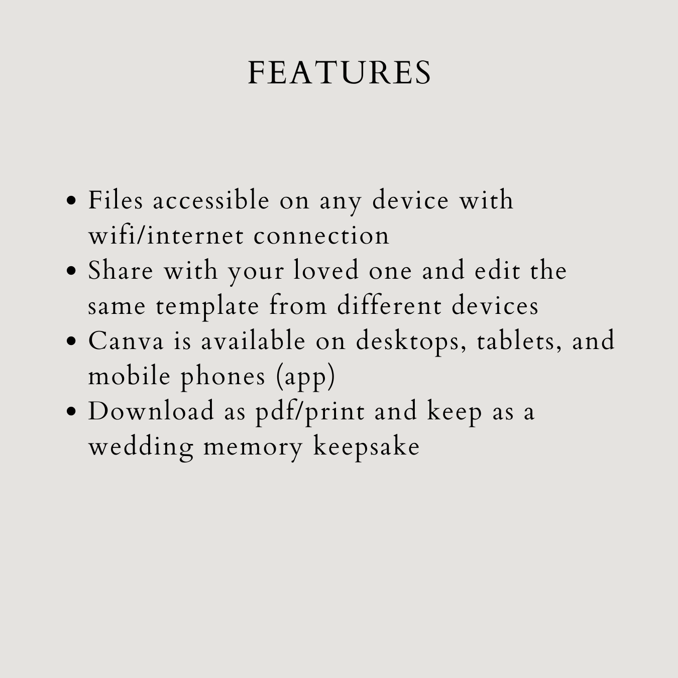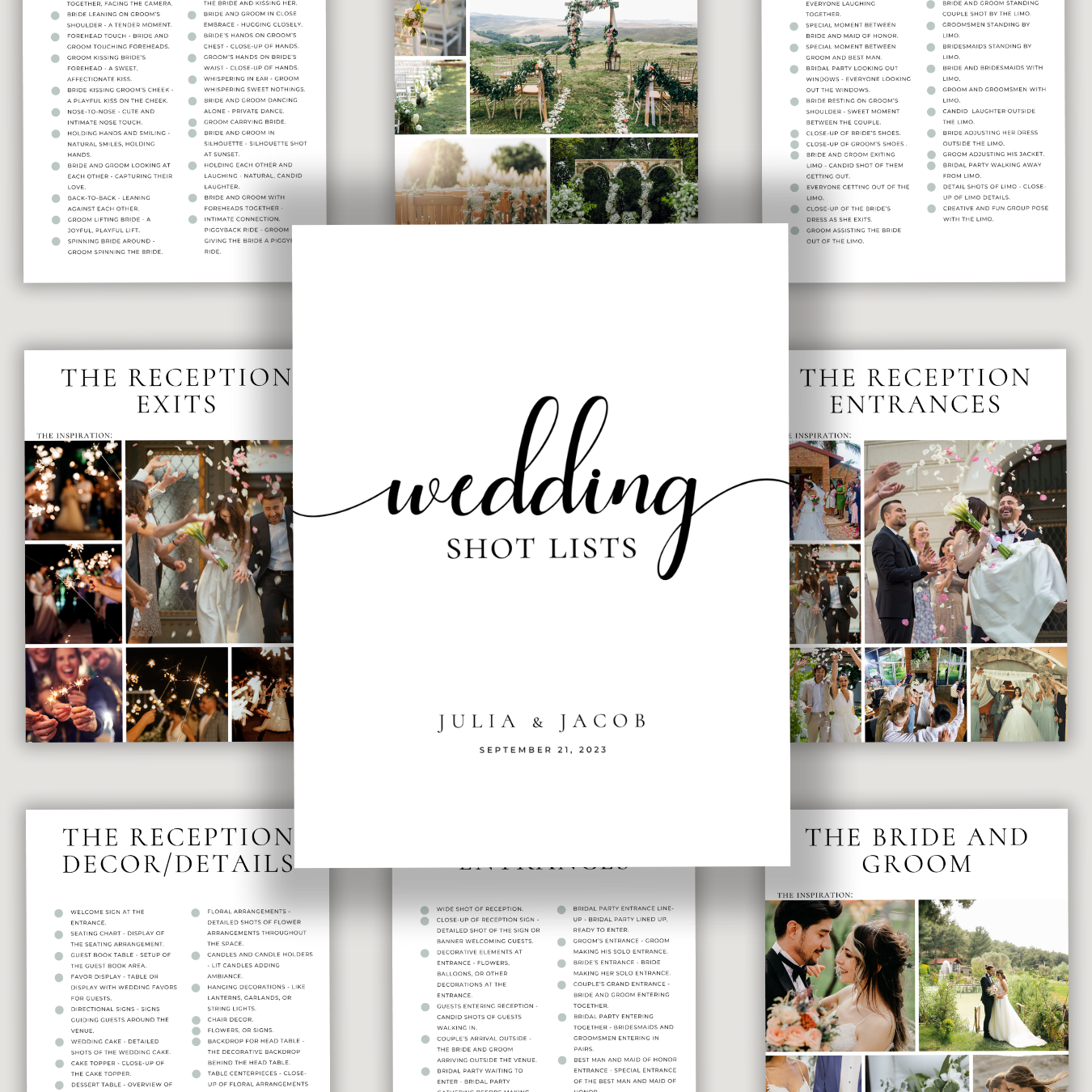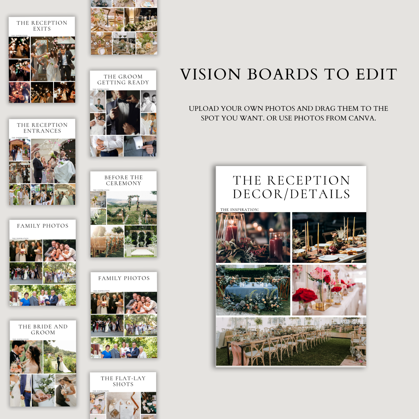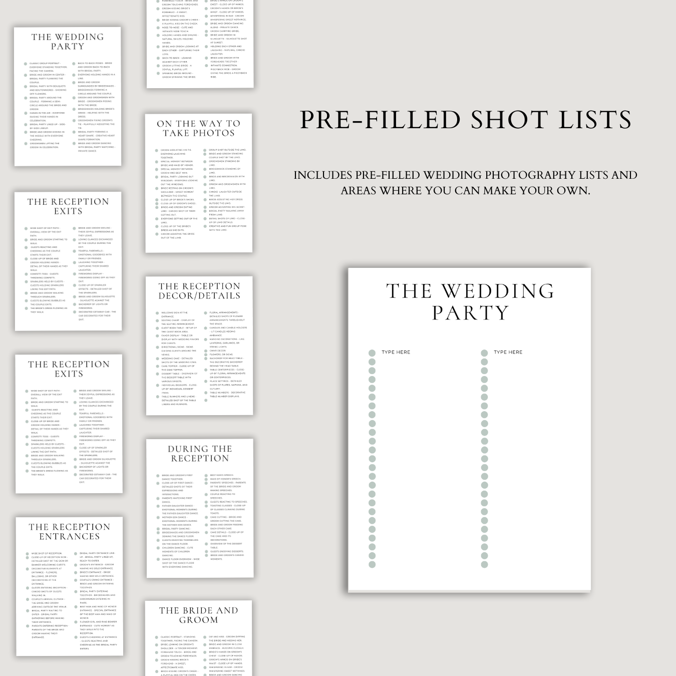 A compilation of photo/shot lists for your photographer to take during your wedding - from start to finish. Included is a combination of pre-filled and un-filled lists as well as vision boards for photo inspiration. 50+ pages.
